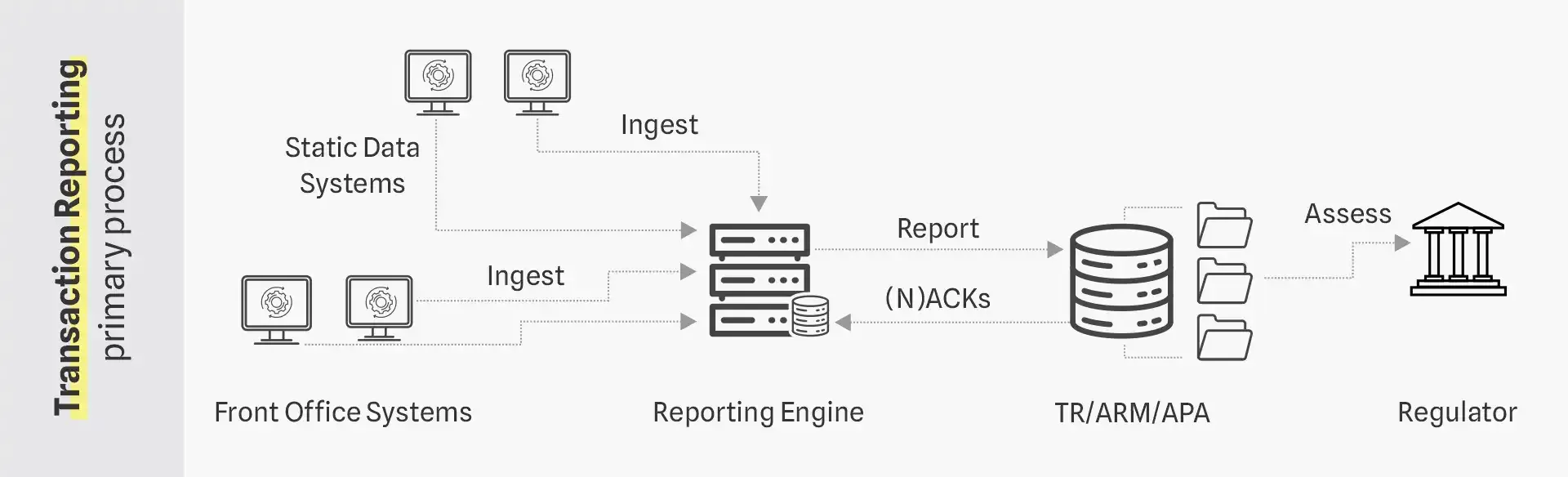 Within a generic Transaction Reporting processes framework, as depicted below, the ingestion of data in the reporting engine is likely not as straight forward as portrayed. It is common to see over a dozen different systems interfaced, with hundreds of data points being bounced back and forth between the systems. Some key challenges can be identified which are summarized in our previous article