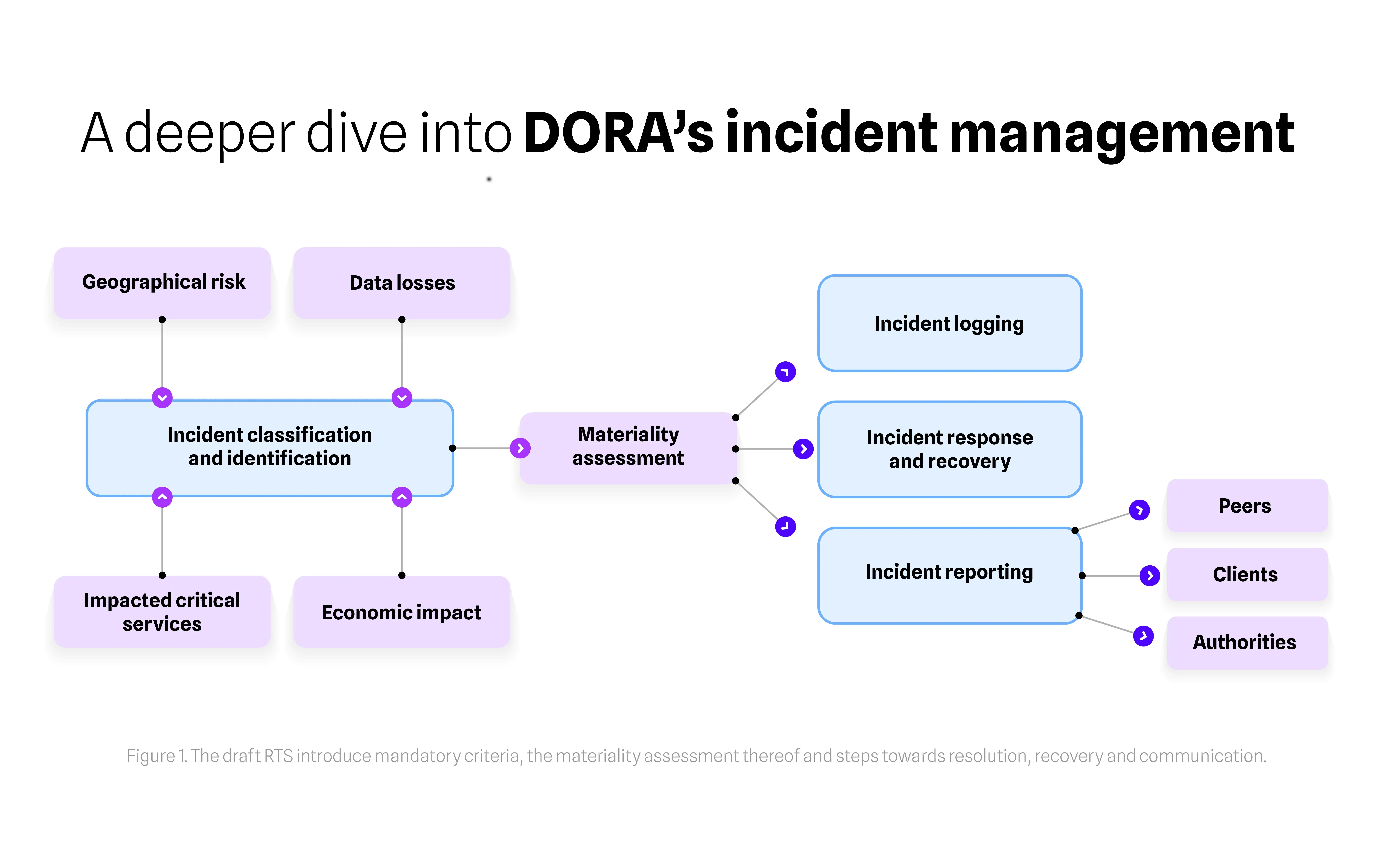 DORA imposes enhanced regulatory obligations for incident management that are significantly more onerous than those in existing regulations. With the level of detail in this new rule-based framework, financial institutions will have to fully re-establish how they deal with incidents. The visual below offers a more in-depth representation of DORA’s incident management process.